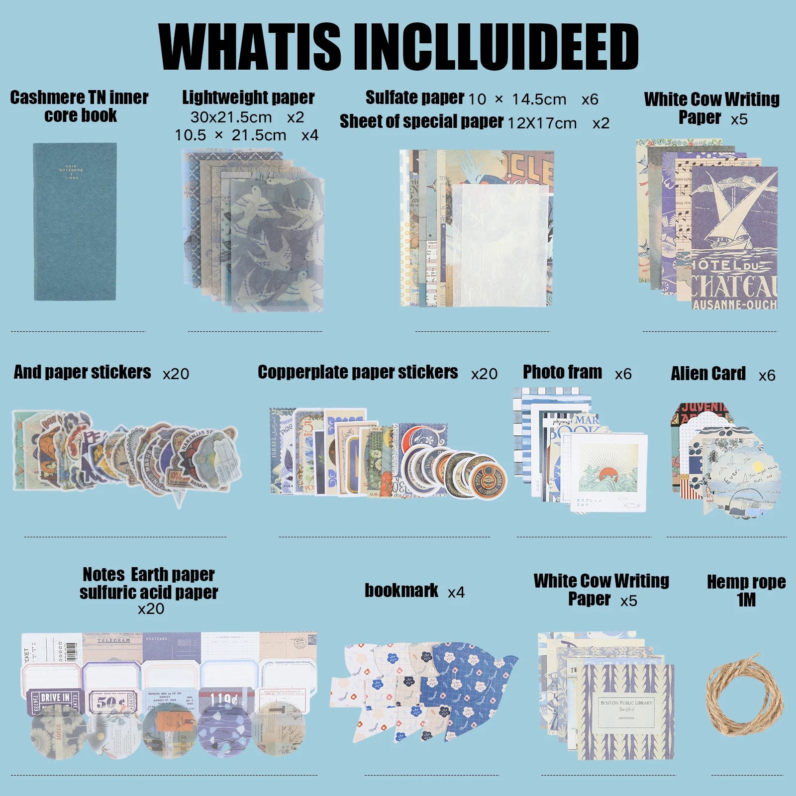 1 x Grid Inside Scrapbook 14 Sheet of Material Paper 20 Sheet of Japanese Paper Stickers 20 Sheet of Copperplate Stickers 4 x Notes Strips 6 Sheet of Shaped Cards 6 Sheet of Framed Cards 10 Sheet of Writing Paper 4 x Bookmarks 1 x Hemp Rope